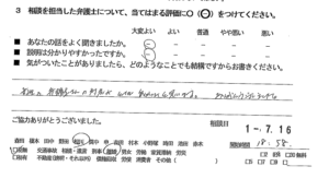 お客様の声(ご相談者の声、評判・口コミ) 公開日:2019/11/20 お客様の声 女性の弁護士さんの対応がとても良かったと思います。 ■あなたの話をよく聞きましたか:大変よい ■説明はわかりやすかったですか:大変よい 「お客様の声(ご相談者の声、評判・口コミ)」 「お客様の声(ご相談者の声、評判・口コミ)」