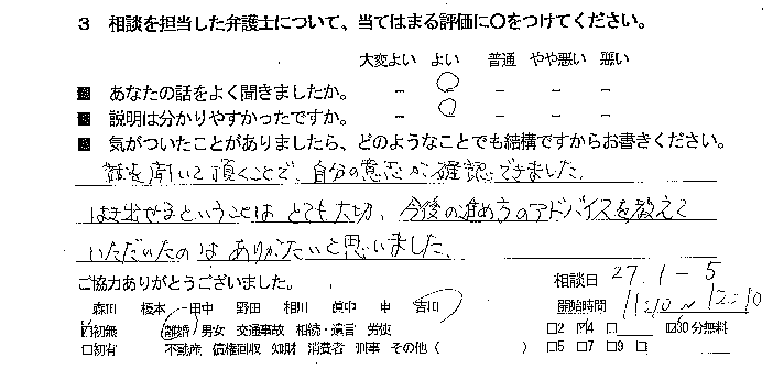お客様の声(129) 公開日:2015/03/27 お客様の声 話を聞いて頂くことで、自分の意思が確認できました。 はき出せるということは、とても大切。 今後の進め方のアドバイスを教えていただいたのは、ありがたいと思いました。 ■あなたの話をよく聞きましたか:よい ■説明はわかりやすかったですか:よい 「お客様の声(130)」 「お客様の声(128)」