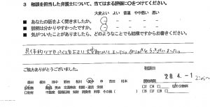 お客様の声(235) 公開日:2016/05/23 お客様の声 具体的なアドバイスを下さり大変助かりました。 ありがとうございました。 ■あなたの話をよく聞きましたか:大変よい ■説明はわかりやすかったですか:大変よい 「お客様の声(236)」 「お客様の声(234)」
