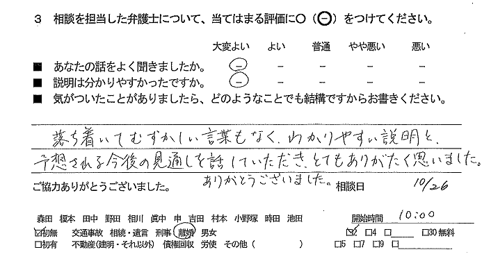 お客様の声(ご相談者の声、評判・口コミ) 公開日:2019/08/23 お客様の声 落ち着いて難しい言葉もなく、わかりやすい説明と、予想される今後の見通しを話していただき、とてもありがたく思いました。 ありがとうございました。 ■あなたの話をよく聞きましたか:大変よい ■説明はわかりやすかったですか:大変よい 「お客様の声(ご相談者の声、評判・口コミ)」 「お客様の声(ご相談者の声、評判・口コミ)」