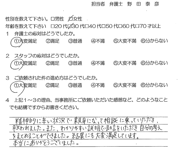 お客様の声(ご依頼者の声)口コミ・評判 公開日:2023/04/06 お客様の声 精神的に辛い状況で親身になって相談に乗っていただき、救われました。 また、わかりやすい説明で助言をいただき自分の考えをまとめることができました。 結果にも大変満足しています。 本当にありがとうございました。 1 弁護士の対応はどうでしたか:大変満足 2 スタッフの対応はどうでしたか:大変満足 3 ご依頼された件の進め方はどうでしたか:大変満足 「お客様の声(離婚カウンセリング)口コミ・評判」 「お客様の声(相談者の声 口コミ・評判)」