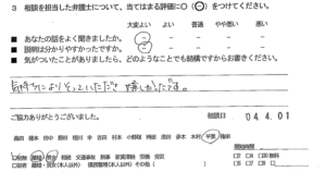 お客様の声(ご相談者の声)口コミ・評判 公開日:2023/04/25 お客様の声 気持ちによりそっていただき嬉しかったです。 ■あなたの話をよく聞きましたか:大変よい ■説明はわかりやすかったですか:大変よい 「お客様の声(ご相談者の声)口コミ・評判」 「お客様の声(ご相談者の声)口コミ・評判」