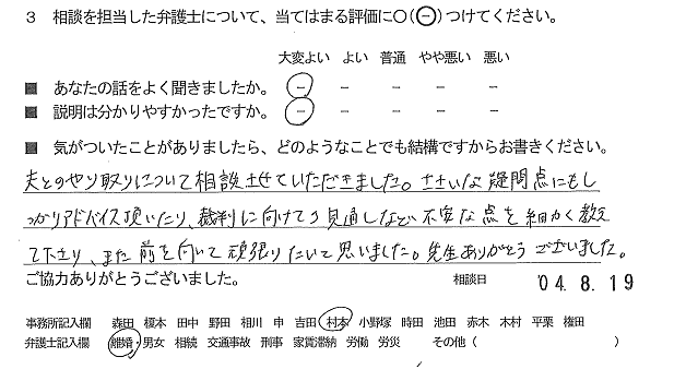 お客様の声(ご相談者の声)口コミ・評判 公開日:2023/04/28 お客様の声 夫とのやり取りについて相談させていただきました。 ささいな疑問点にもしっかりアドバイス頂いたり、裁判に向けて見通しなど不安な点を細かく教えて下さり、また前を向いて頑張りたいと思いました。 先生ありがとうございました。 ■あなたの話をよく聞きましたか:大変よい ■説明はわかりやすかったですか:大変よい 「お客様の声(ご相談者の声)口コミ・評判」 「お客様の声(ご相談者の声)口コミ・評判」