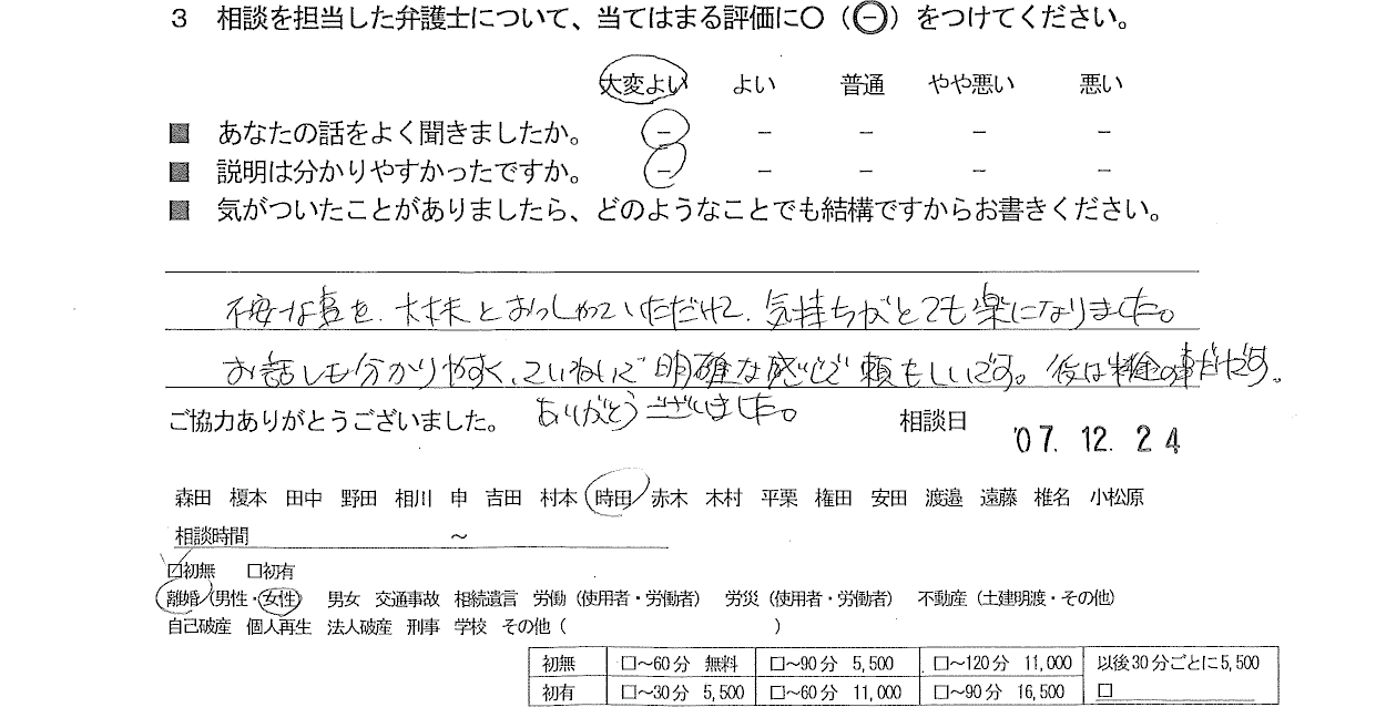 不安な事を、大丈夫とおっしゃっていただけて、気持ちがとても楽になりました。 お話しも分かりやすく、ていねいで明確な感じで頼もしいです。後は料金の事だけです。ありがとうございました。