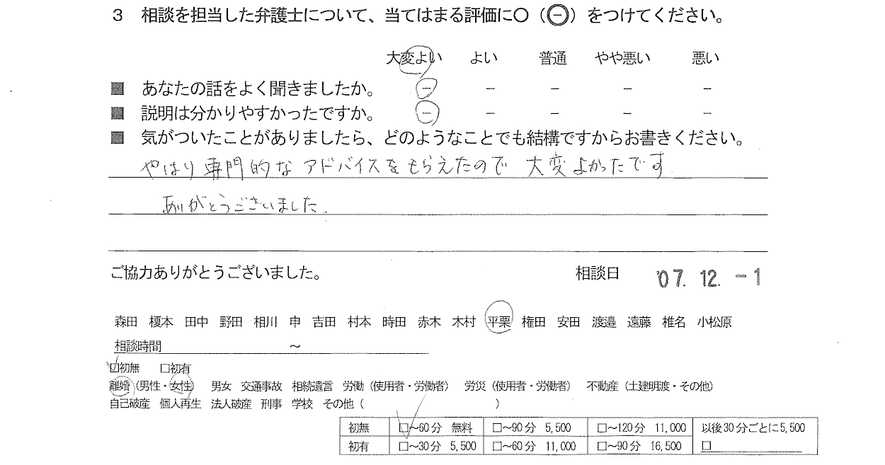 お客様の声(ご相談者の声)評判・口コミ 公開日:2026/01/14 お客様の声 ■年代 ■担当弁護士 ■あなたの話をよく聞きましたか ■説明はわかりやすかったですか - 平栗 丈嗣 大変よい 大変よい やはり専門的なアドバイスをもらえたので大変よかったです。 ありがとうございました。 「お客様の声(ご相談者の声)評判・口コミ」 「お客様の声(ご相談者の声)評判・口コミ」