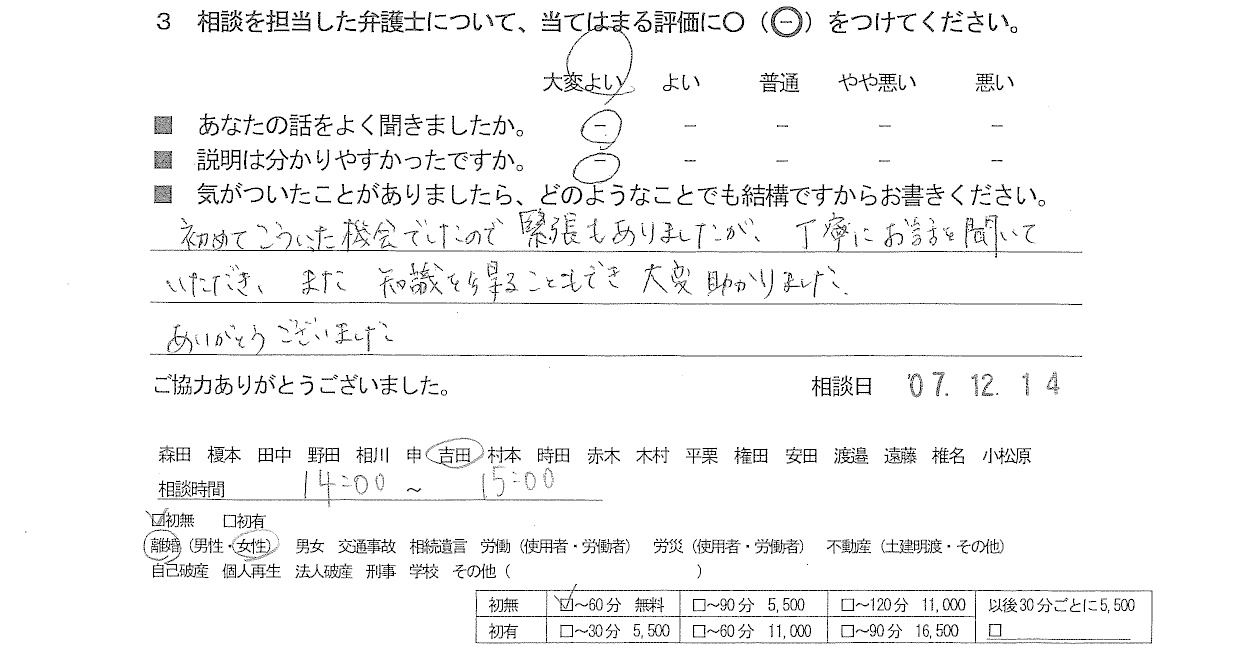 初めてこういった機会でしたので緊張もありましたが、丁寧にお話を聞いていただき、 また 知識を得ることもでき 大変助かりました。ありがとうございました。