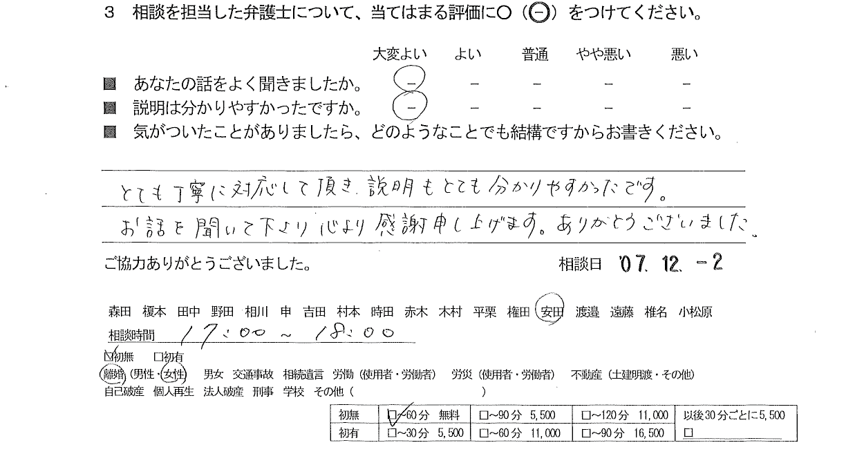 とても丁寧に対応して頂き、説明もとても分かりやすかったです。 お話を聞いて下さり心より感謝申し上げます。ありがとうございました。