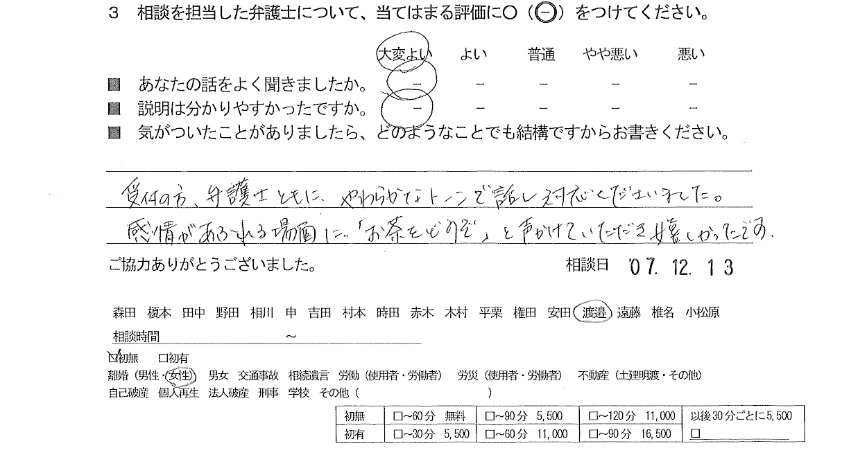 受付の方、弁護士ともに、やわらかなトーンで話し対応くださいました。 感情があふれる場面に、「お茶をどうぞ」と声かけていただき嬉しかったです。