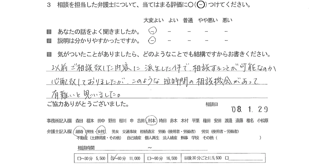 以前ご相談致した内容に派生した件で、相談することが可能なのか心配致しておりましたが、このような短時間の相談機会があって、有り難いと思いました。