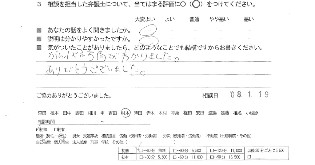お客様の声(ご相談者の声)評判・口コミ 公開日:2026/02/13 お客様の声 ■担当弁護士 村本 拓哉 ■あなたの話をよく聞きましたか 大変よい ■説明はわかりやすかったですか 大変よい がんばる方向がわかりました。ありがとうございました。 関連記事: お客様の声(ご相談者の声)口コミ・評判 お客様の声(ご相談者の声)口コミ・評判 お客様の声(離婚カウンセリング)口コミ・評判 お客様の声(ご相談者の声)口コミ・評判 「お客様の声(ご相談者の声)評判・口コミ」
