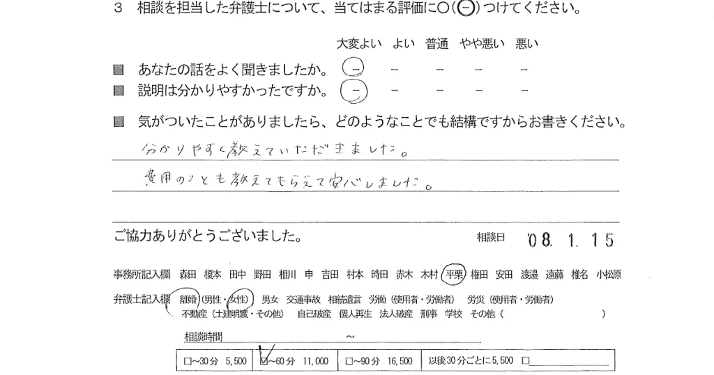 分かりやすく教えていただきました。費用のことも教えてもらえて安心しました。