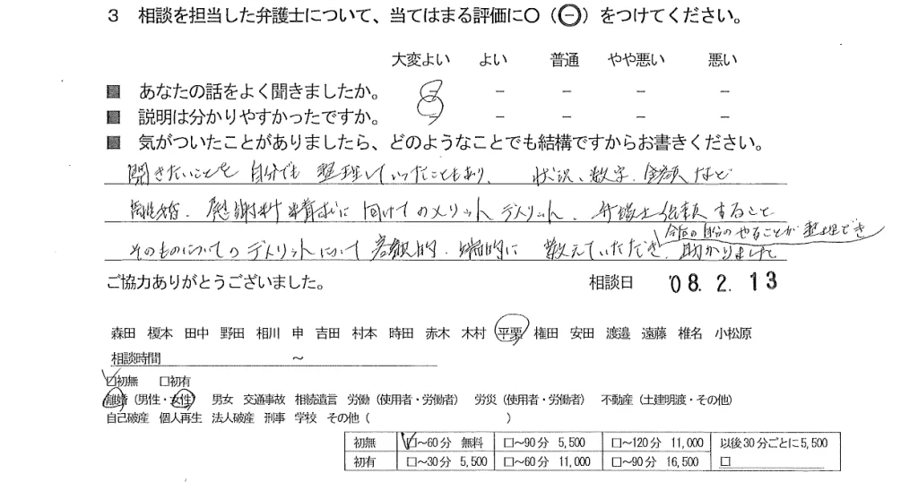 聞きたいことを自分でも整理していったこともあり、状況、数字、金額など 離婚、慰謝料請求についてのメリットデメリット、弁護士依頼することそのものについてのデメリットについて客観的・端的に教えていただき、今の自分のやることが整理でき、助かりました。