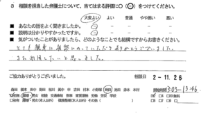 お客様の声(ご相談者の声、評判・口コミ) 公開日:2023/11/17 お客様の声 とても親身に相談にのっていただきありがとうございました。また利用したいと思いました。 ■あなたの話をよく聞きましたか:大変よい ■説明はわかりやすかったですか:大変よい 「お客様の声(ご依頼者の声)評判・口コミ」 「お客様の声(離婚カウンセリング)評判・口コミ」